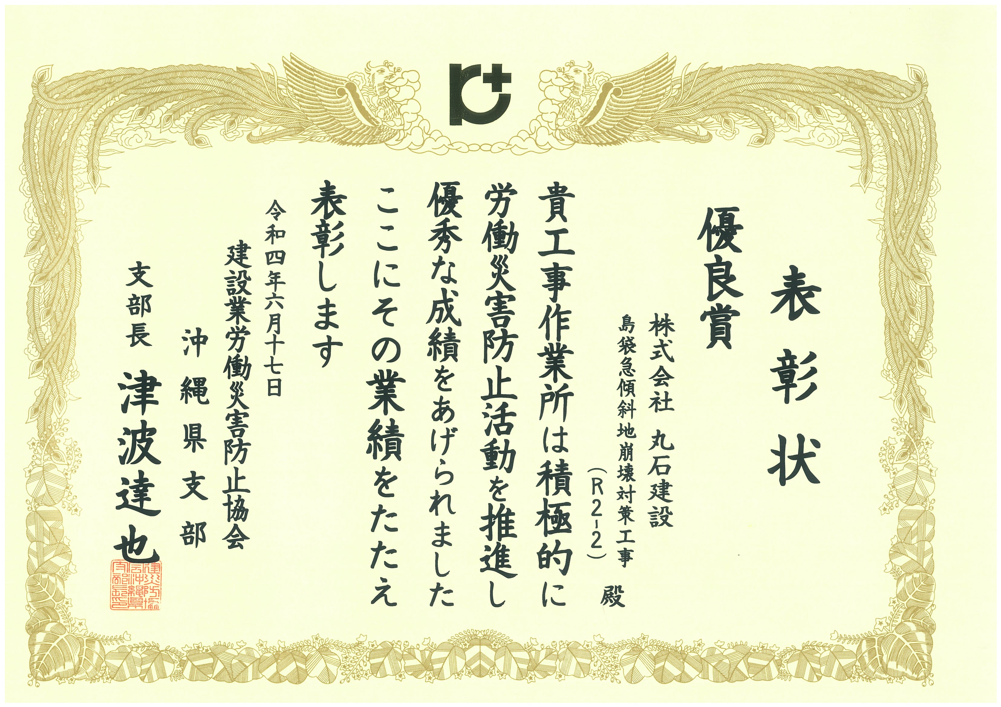 令和4年6月 建設業労働災害防止協会 沖縄県支部より表彰