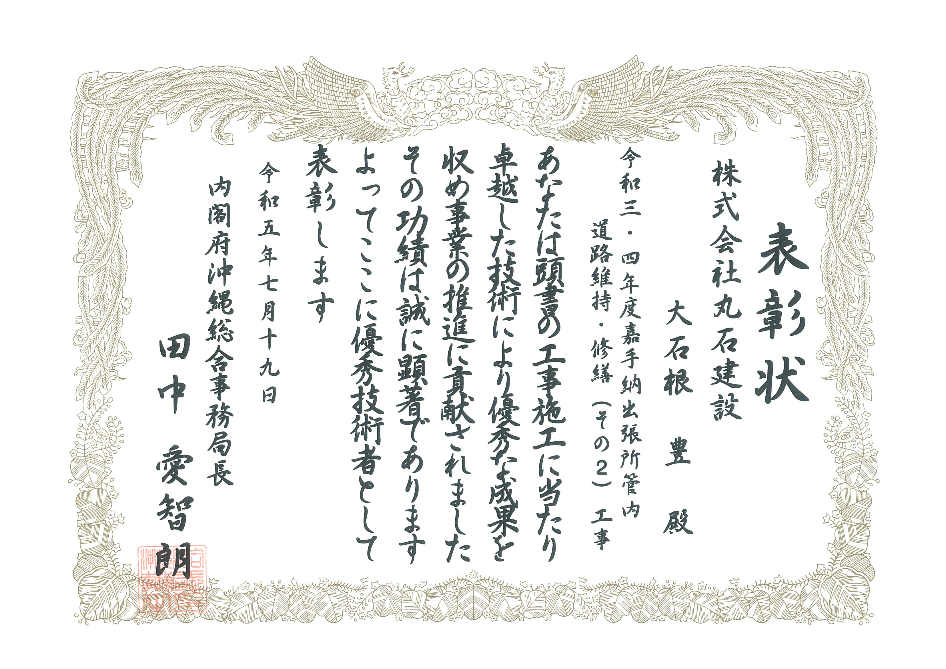 令和5年7月 沖縄総合事務局長より表彰